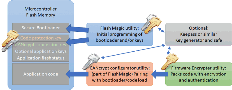 Our secure bootloader implementation uses two symmetric keys to protect both the code and the bootloader activation process separately. The manufacturer uses a code protection key to encrypt and authenticate the firmware (here using AES-GCM). An additional CANcrypt connection key is used to connect an authorized update utility to the bootloader. This allows an additional protection level, as only an authorized system integrator, technician or utility can activate the bootloader in the first place.